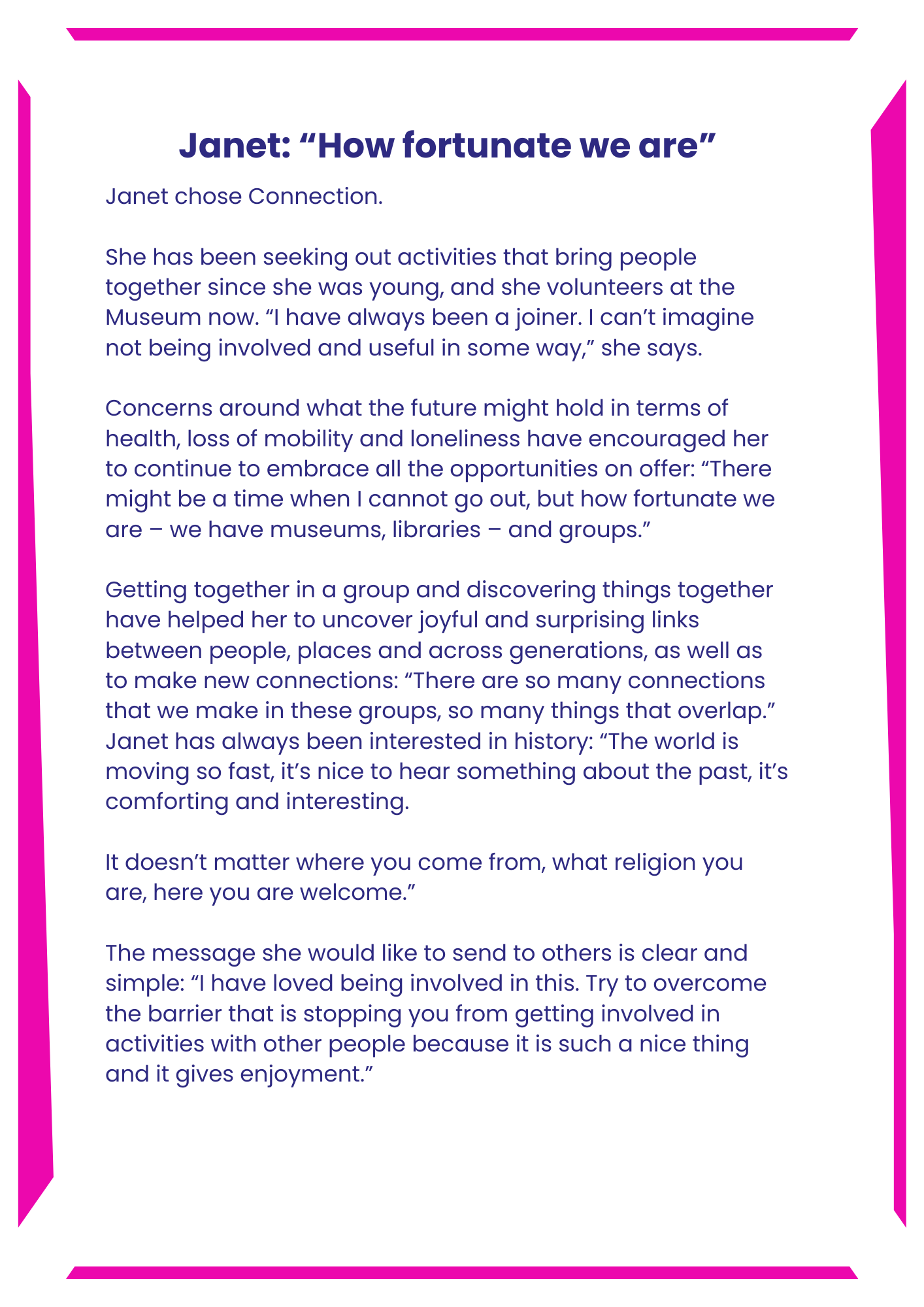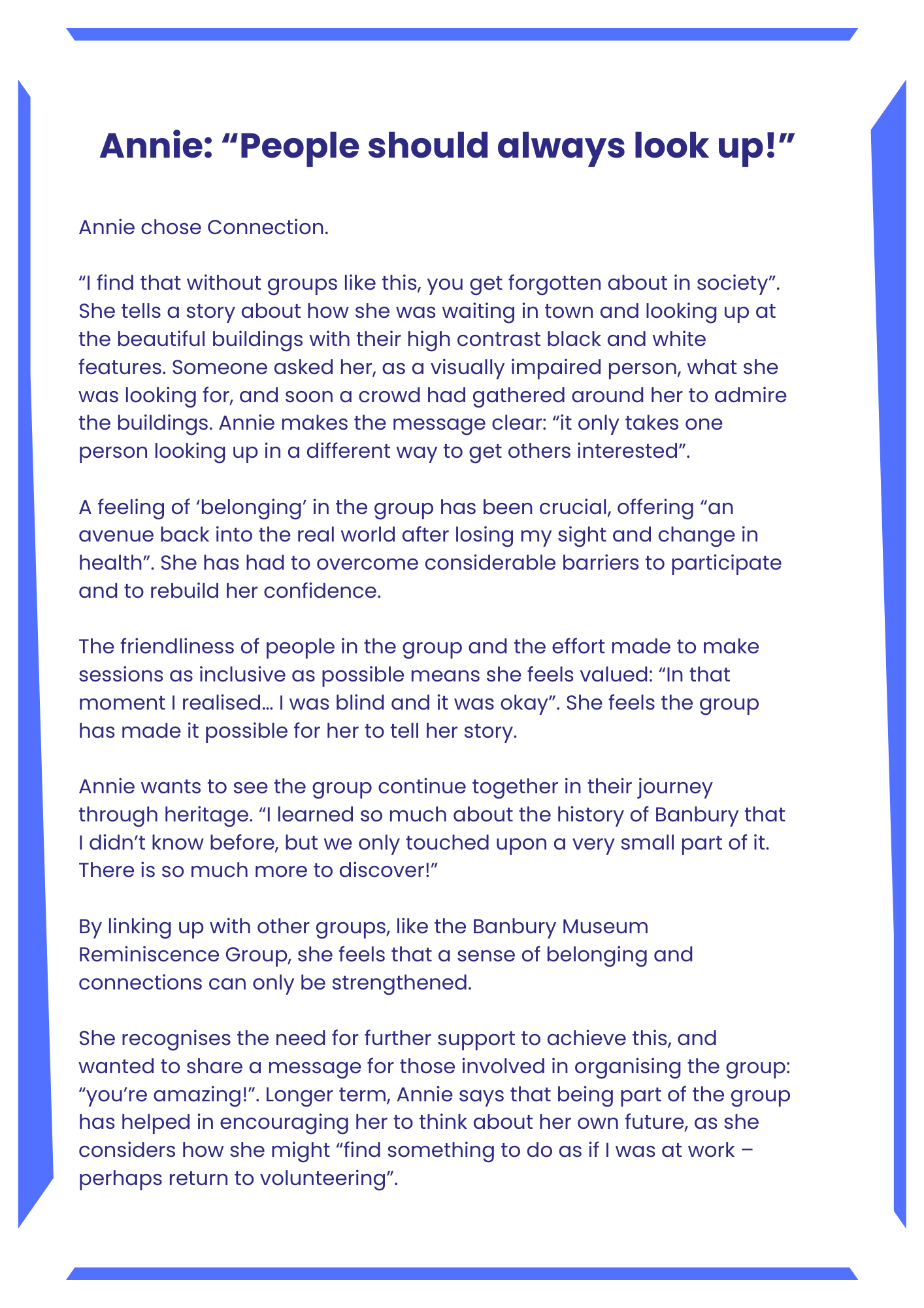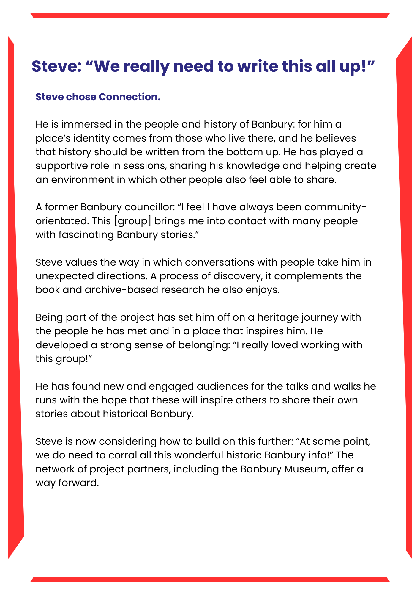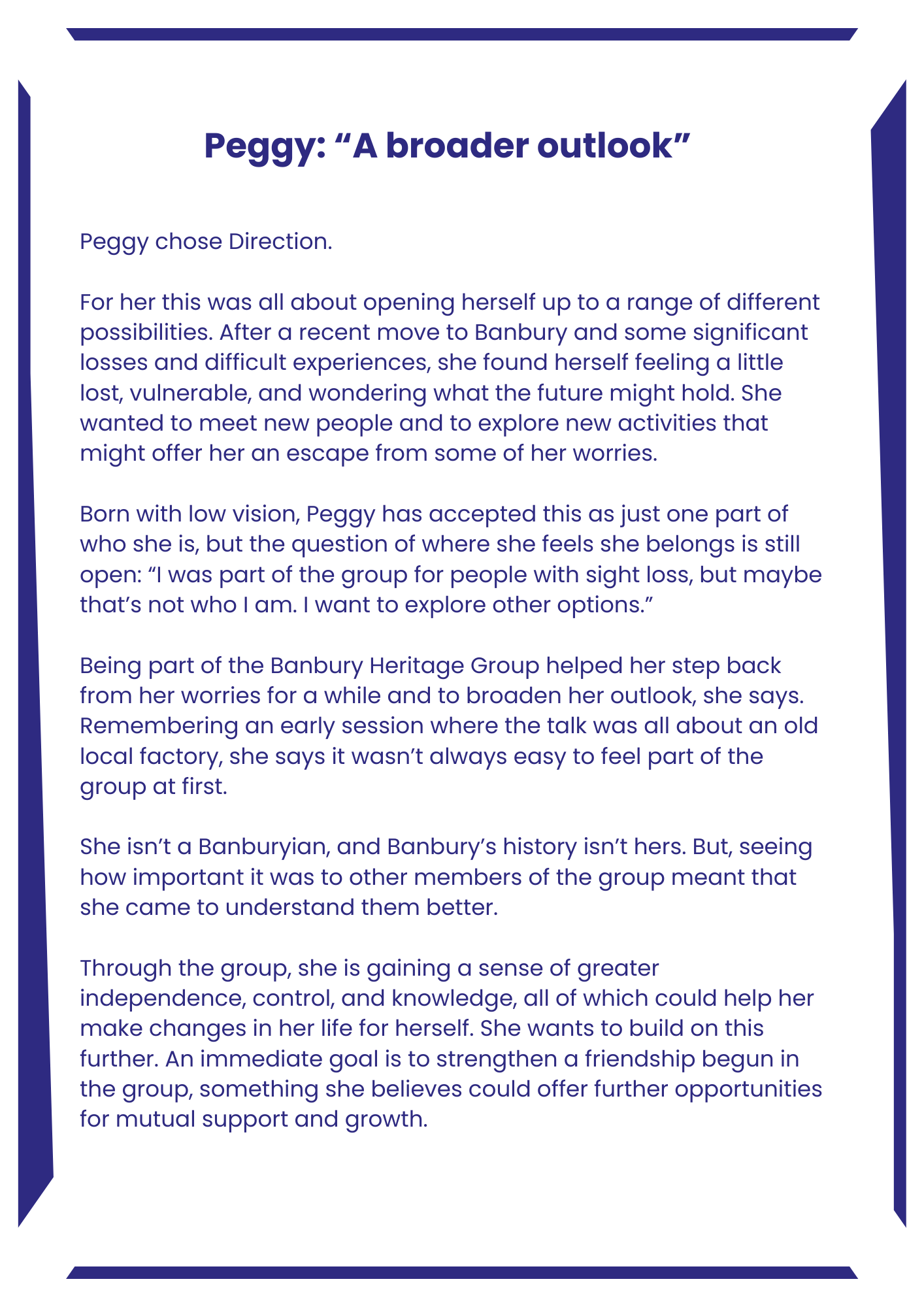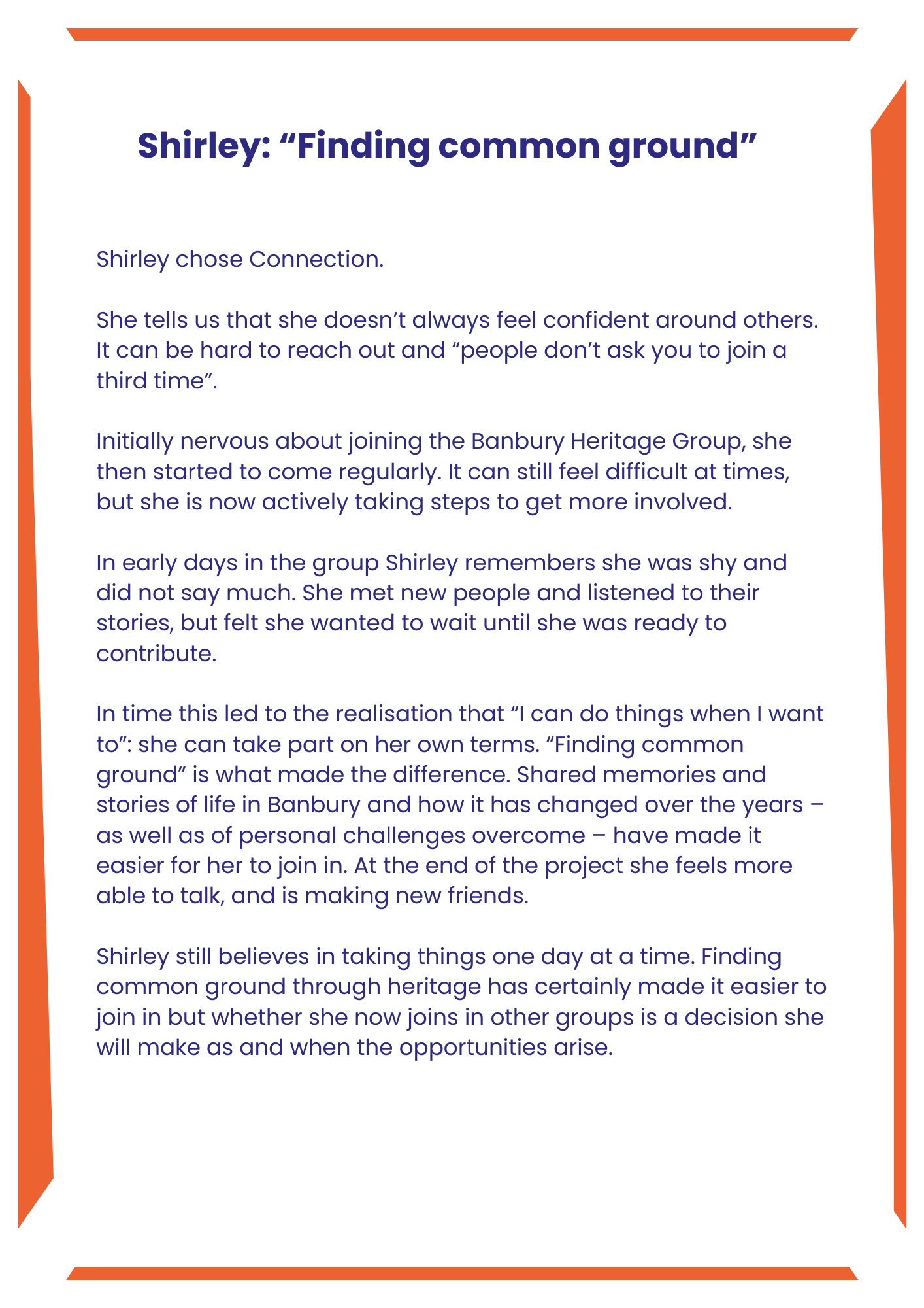 At the end of the Banbury Heritage Project, participants shared their stories of why they first got involved, the impacts the project had for them, and what they might do next. These ‘Wellbeing Stories’ were captured and crafted together through a new wellbeing Reflection Tool that is still in development.